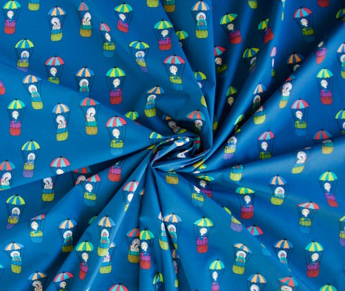 Just peeking over the binding you can see this fabric’s namesake, Dogulee (16), in her green and yellow hot air balloon. She was brought to life by the magical creature ‘Boes’ and can travel freely between the past and future.