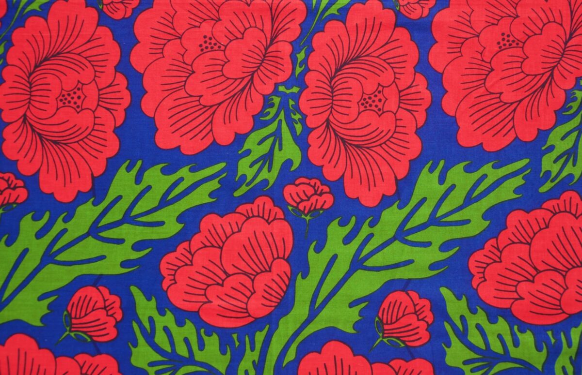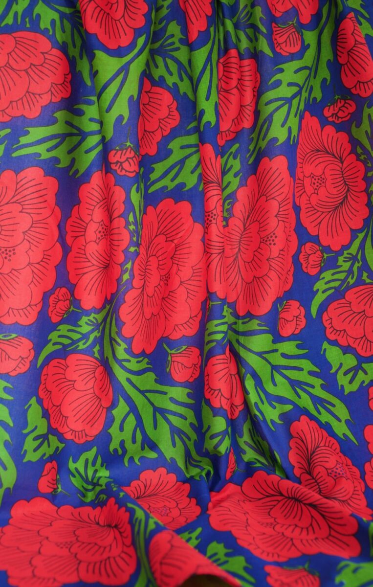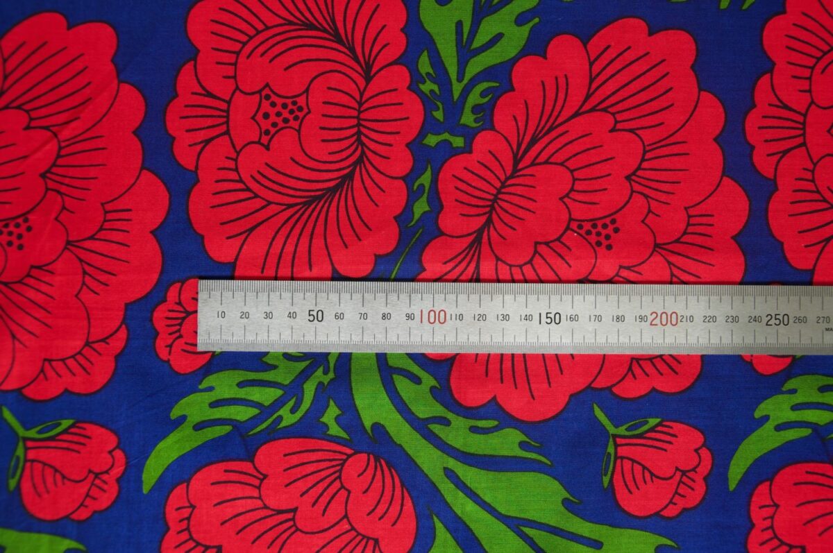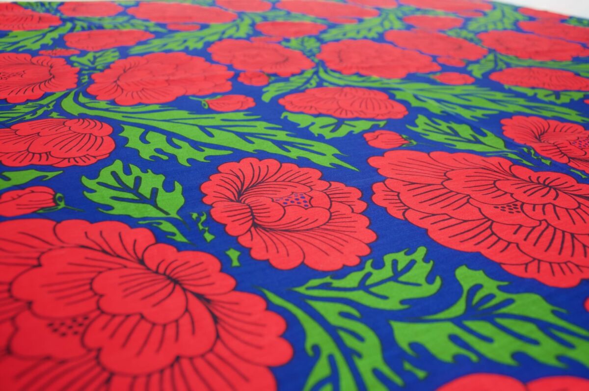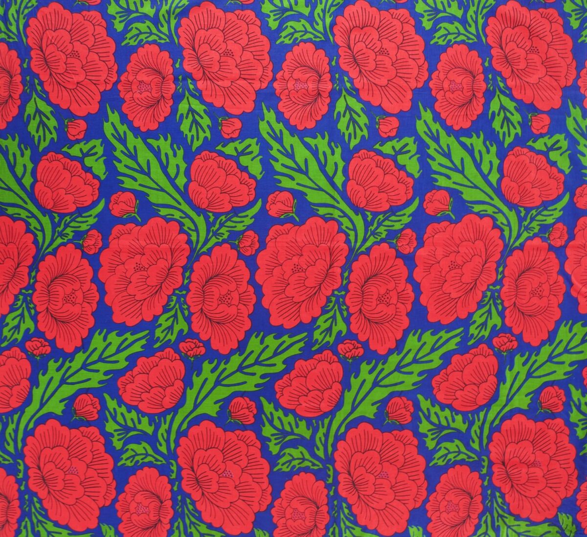 Botan means Peony and this deep blue background is covered in vibrant red peonies with dramatic green leaves.