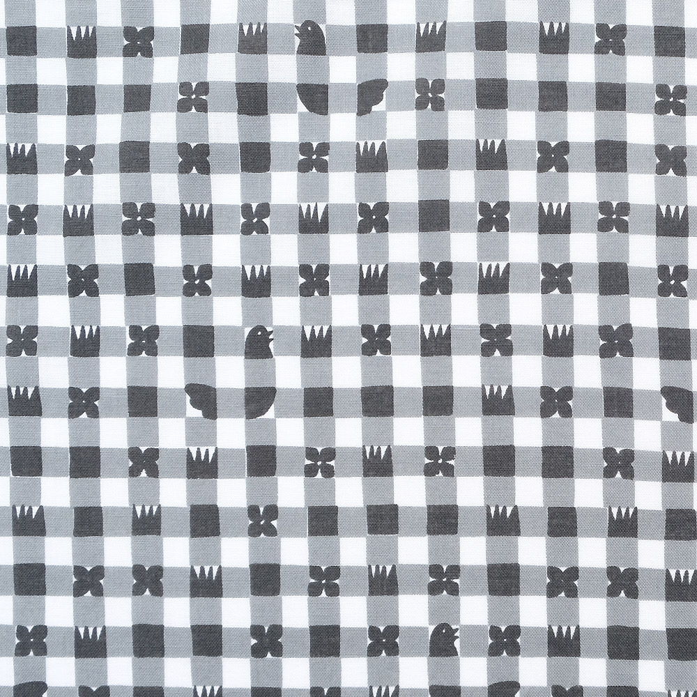 Rooster Check features a playful twist on the classic gingham with charming chickens, flowers, and grass motifs hidden amongst the charcoal and soft grey squares. The white background provides a beautiful contrast. Perfect for adding a fun, quirky touch of personality to your next project!