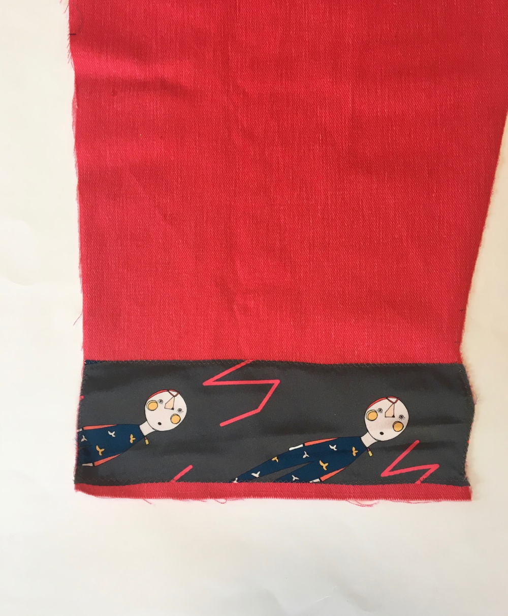 For the cuffs, I appliquéd the designer fabric to the outside of the front and back pants pieces, where the pattern showed interfacing was needed for the cuffs and extended it a little at the top and bottom to ensure that it wrapped over the fold of the cuff.
